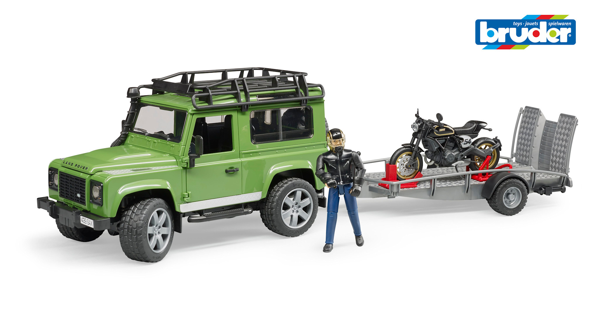 Bruder 2598 - Land Rover Defender met aanhanger en Ducati motor en berijder