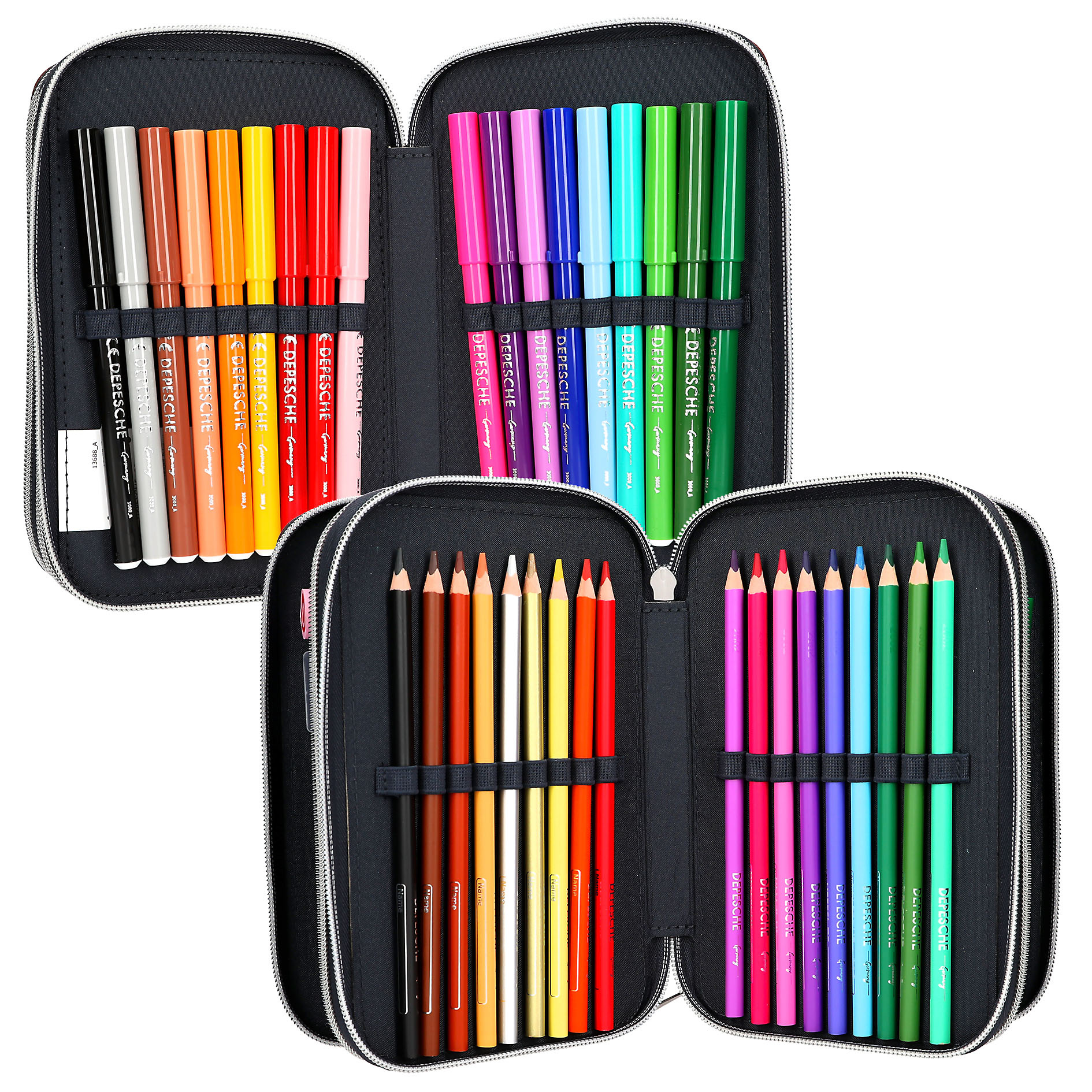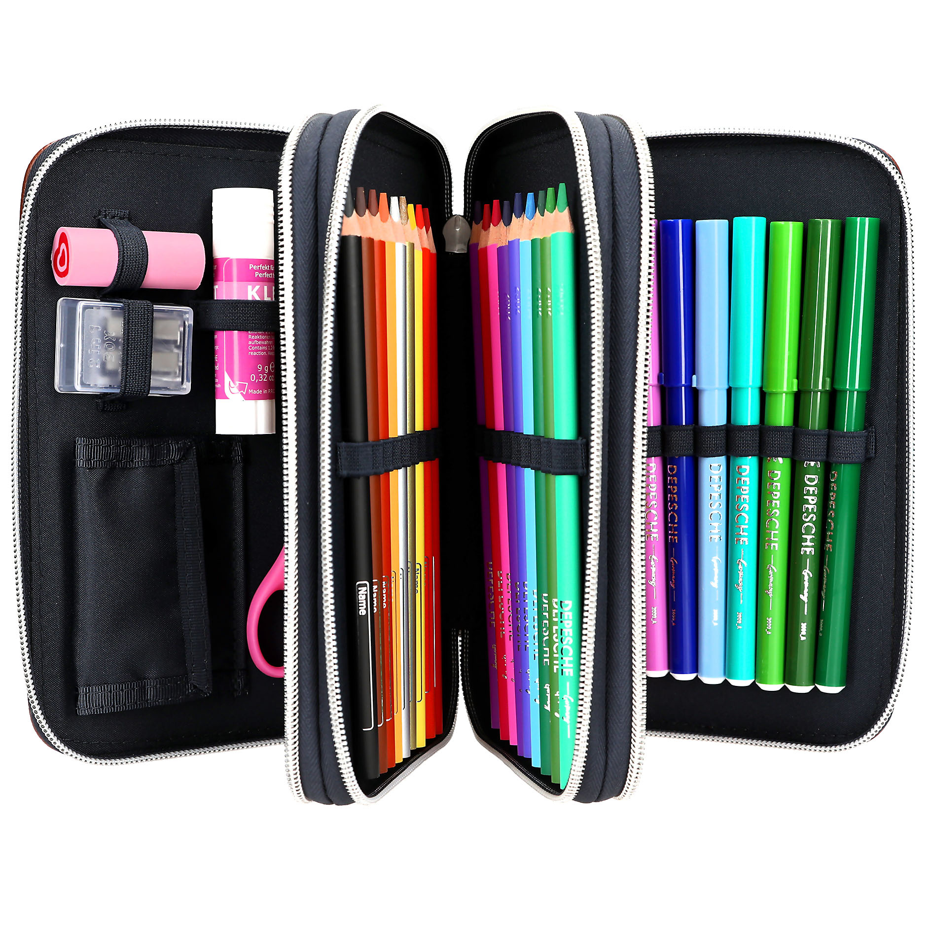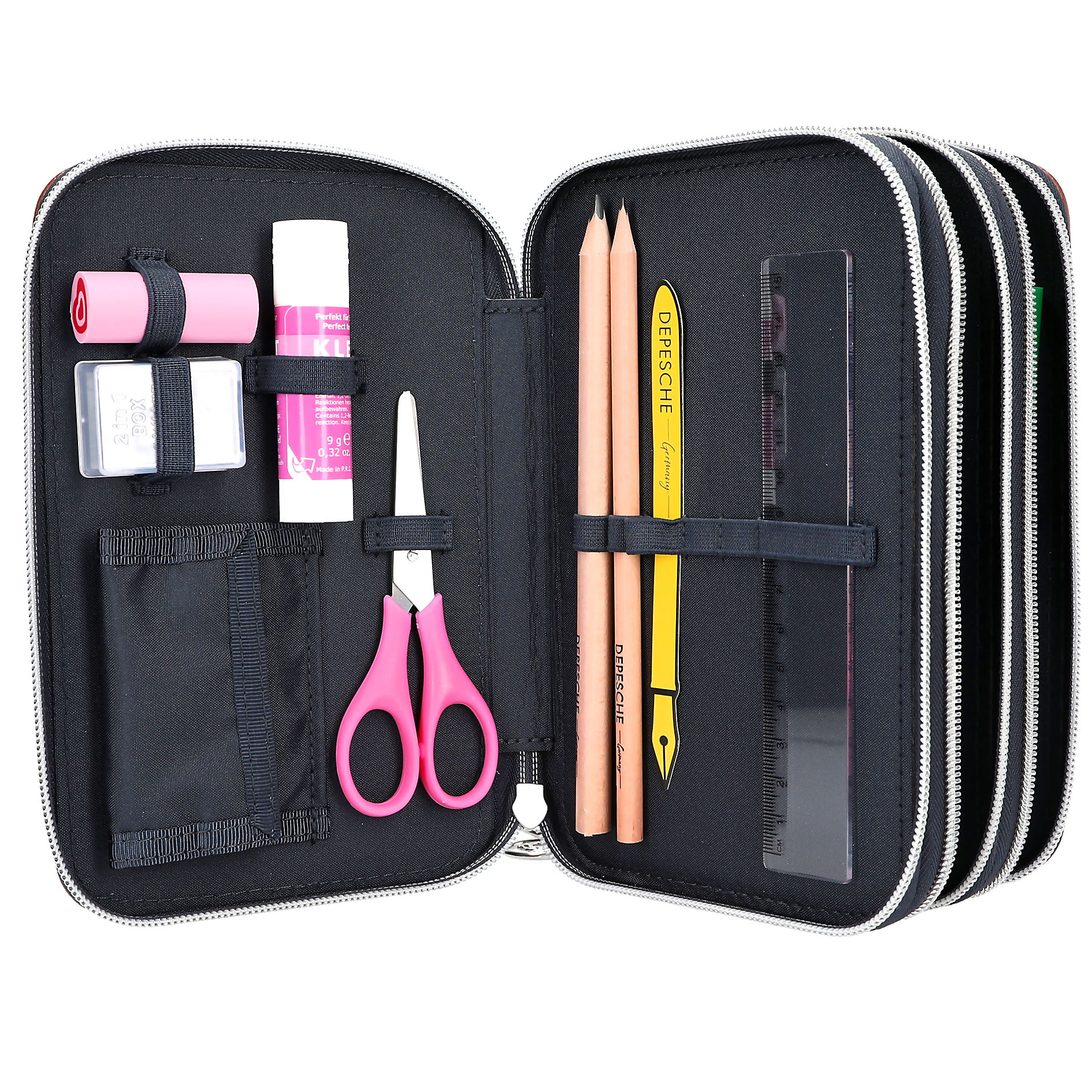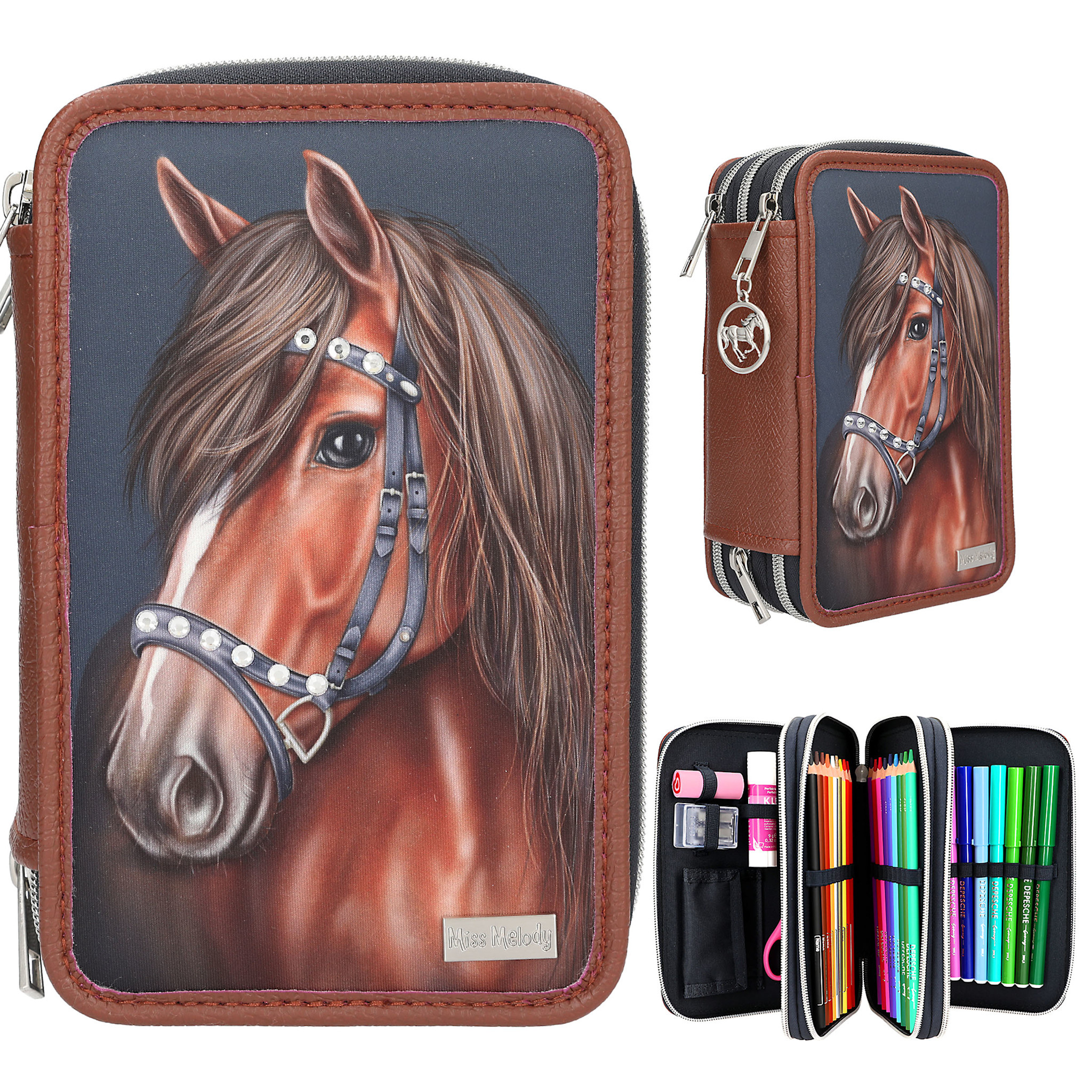 Het donkerblauwe etui van Miss Melody heeft donkerbruine details van veganistisch leer en een groot, bruin paardenhoofd op de voorkant met elegante glittersteentjes op het halster. Leuk extraatje: de munt met paardenmotief als hanger aan de rits. De drie aparte vakken zijn compleet gevuld met 18 kleurpotloden, 18 viltstiften, 2 potloden, een puntenslijper, gum, liniaal, schaar, lijmstift en een klein klittenbandvakje. Hoofdmateriaal: 100 procent polyester; afwerking: 100 procent PU.