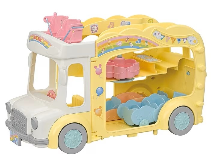 Regenboog Babybus is een driedekker kinderdagverblijfbus met plaats voor 28 baby's (inclusief wiegbaby's). Deze set is exclusief speelfiguren ( apart verkrijgbaar). Je kunt de bus open klappen tot een speeltuin. Dus 2 speelfuncties, bus of speeltuin. De stoelen kun je veranderen in een draaimolen, schommel , glijbaan, wip, piano en wandelwagen. Stimuleert verhalen verzinnen voor kinderen. Geschikt voor kinderen vanaf 3 jaar en ouder.