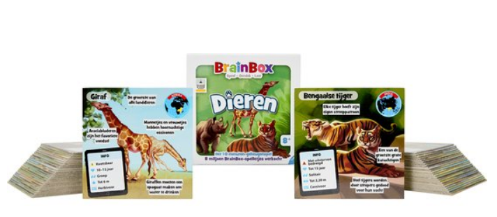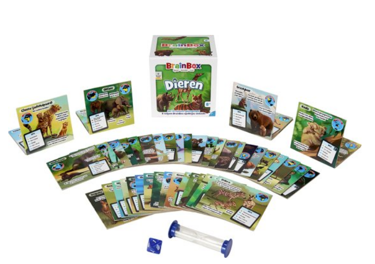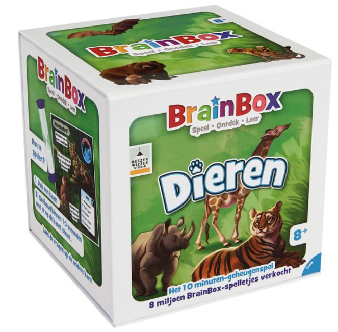 BrainBox Dieren test jouw oog voor detail. Je moet namelijk vragen beantwoorden waarvan je de antwoorden al voor ogen hebt gehad. Enige nuance is dat je de antwoorden slecht tien seconden hebt mogen zien. Spelverloop: Pak een kaart van de BrainBox, met de afbeelding naar boven. Draai de zandloper om. Bestudeer de kaart en probeer zo veel mogelijk details te onthouden. Gooi de dobbelsteen. Beantwoord de vraag bij het cijfer dat je hebt gegooid. Heb je het antwoord goed? Mag je de kaart houden. Anders moet je deze afleggen. Tel na tien minuten je kaarten. Het aantal kaarten is jouw puntenaantal. Heb je de meeste punten, dan win je!