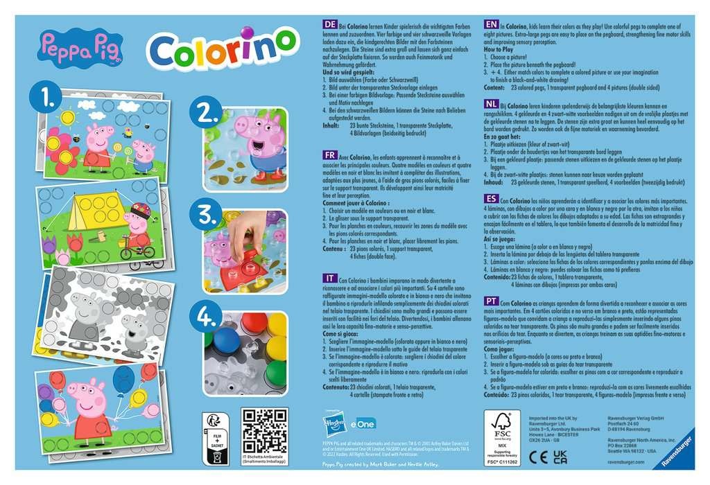 Het creatieve insteekspel met Peppa Pig. Bij Colorino leren kinderen spelenderwijs kleuren kennen. Door de kleurrijke stenen op de plaatjes te leggen, leren ze bovendien hun fijne motoriek en concentratie ontwikkelen.