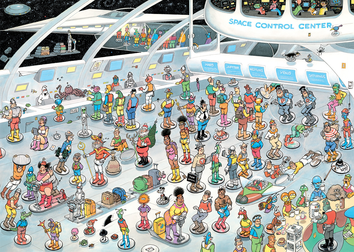 In deze 2 - in - 1 puzzel nemen we een kijkje in de toekomst en in de wereld van comicon! Stap in de tijdmachine en reis mee naar een wereld vol sterren en technologie: hoe zou een ruimtestation er in de toekomst uitzien? En in wat voor bizarre, futuristische wereld zal de Jan van Haasteren - familie straks ronddwalen? De familie van Jan van Haasteren duikt in de betoverende wereld van comics, manga, cosplay, gaming, films, series, sci - fi, fantasy en nog veel meer. Overal waar ze kijken: verklede helden, bizarre wezens en onverwachte avonturen. Kortom… de ultieme geek ervaring!