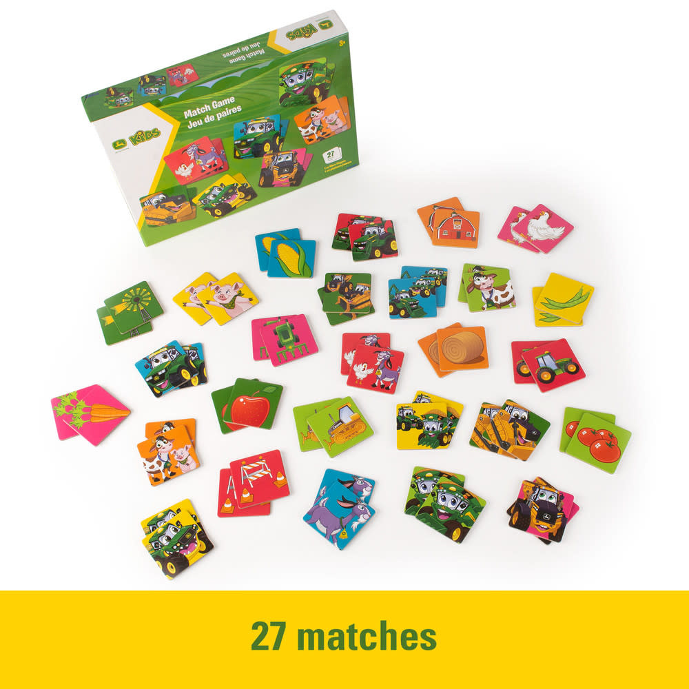 Hoe goed is je geheugen? Het John Deere Memory Game bevat kindvriendelijke personages zoals Johnny Tractor en andere bekende boerderijdieren. Maaidorsers, bulldozers, vrolijke dieren en nog veel meer: ze zijn allemaal klaar voor een overvloed aan plezier! De dikke en stevige kaartjes zijn perfect om om te draaien en weer terug te keren. Dit klassieke memoryspel is een geweldige manier om kinderen vanaf 3 jaar bij spelavonden te betrekken. En met in totaal 54 kaartjes zijn er 27 combinaties te maken, een leuke uitdaging voor het hele gezin.