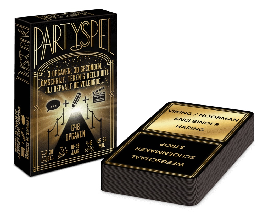 PARTYSPEL – Editie #1 is een hilarisch en hectisch pocketformaat (hoe kan het ook anders) partyspel dat in iedere broekzak past (9,0 × 6,0 × 1,9 cm dus brievenbuspost) en gegarandeerd veel lol brengt! Dit compacte raadspel is geschikt voor grote groepen (4-12 spelers van 10-99 jaar); vrienden, familie, collega's of wie dan ook! En je speelt het overal; thuis, op kantoor of in de kroeg! Je probeert binnen 30 seconden je team de 3 opgaven van een kaart te laten raden. Maar... één opgave moet je omschrijven met woorden, één opgave moet je tekenen en één opgave moet je uitbeelden! Welke opgave je hoe doet, bepaal je zelf. Net zoals de volgorde! Dus denk snel maar goed na want voor je het weet sta je een 'kokosnoot' na te doen. Dit snelle gezelschapsspel (dat 'eco friendly' gemaakt is van FSC karton in een 100% biologisch afbreekbaar cellofaantje) levert veel gezelligheid en grappige momenten! Perfect voor Kerst, Oudjaarsavond, een vriendenavond, een familiefeest of gewoon zomaar! Inhoud 54 opgavekaarten (met in totaal 648 opgaven) 2 spelregelkaarten Highlights Pocketformaat – past in elke broekzak / brievenbuspost Geschikt voor 4-12 spelers van 10-99 jaar 3 opgaven, 30 seconden; omschrijven, tekenen en uitbeelden Door de tijdsdruk ga je soms de mist in... dus dat wordt lachen! Met iedereen te spelen; vrienden, familie of collega's Overal te spelen; thuis, in de kroeg of op kantoor Bevat 648 opgaven 'Eco friendly': gemaakt van FSC-karton en verpakt in 100% biologisch afbreekbaar cellofaan Spelregels in het kort Pak een kaart en bekijk de 3 opgaven. Bepaal hoe je welke opgave gaat laten raden door je team. Probeer de opgaven te laten raden; één omschrijf je, één teken je en één beeld je uit! Je scoort 1 punt per gerade opgave. Nu is een ander team aan de beurt etc. totdat een team 15 punten of meer behaald heeft en wint! PARTYSPEL – Editie #1; klein doosje, klein prijsje, groot plezier!