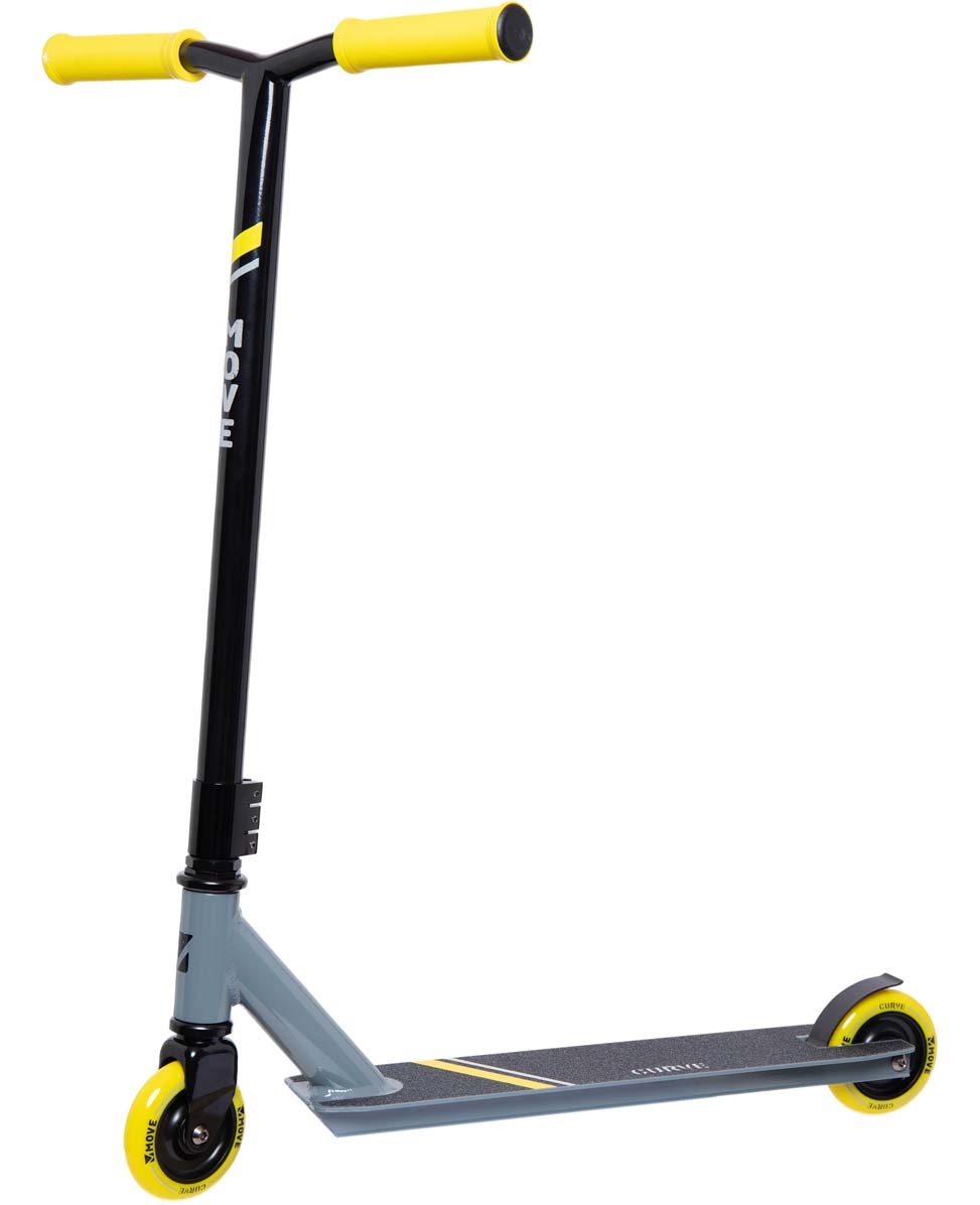 Stevige stuntstep in leuk Grijs/gele kleurstelling. Deck met coating, 48x98x2 mm. T-vormig stuur met gele handvaten. Wielmaat 100 mm met Abec 7 wiellagers. Hoogte 80 cm. Max gewicht 100 kg.