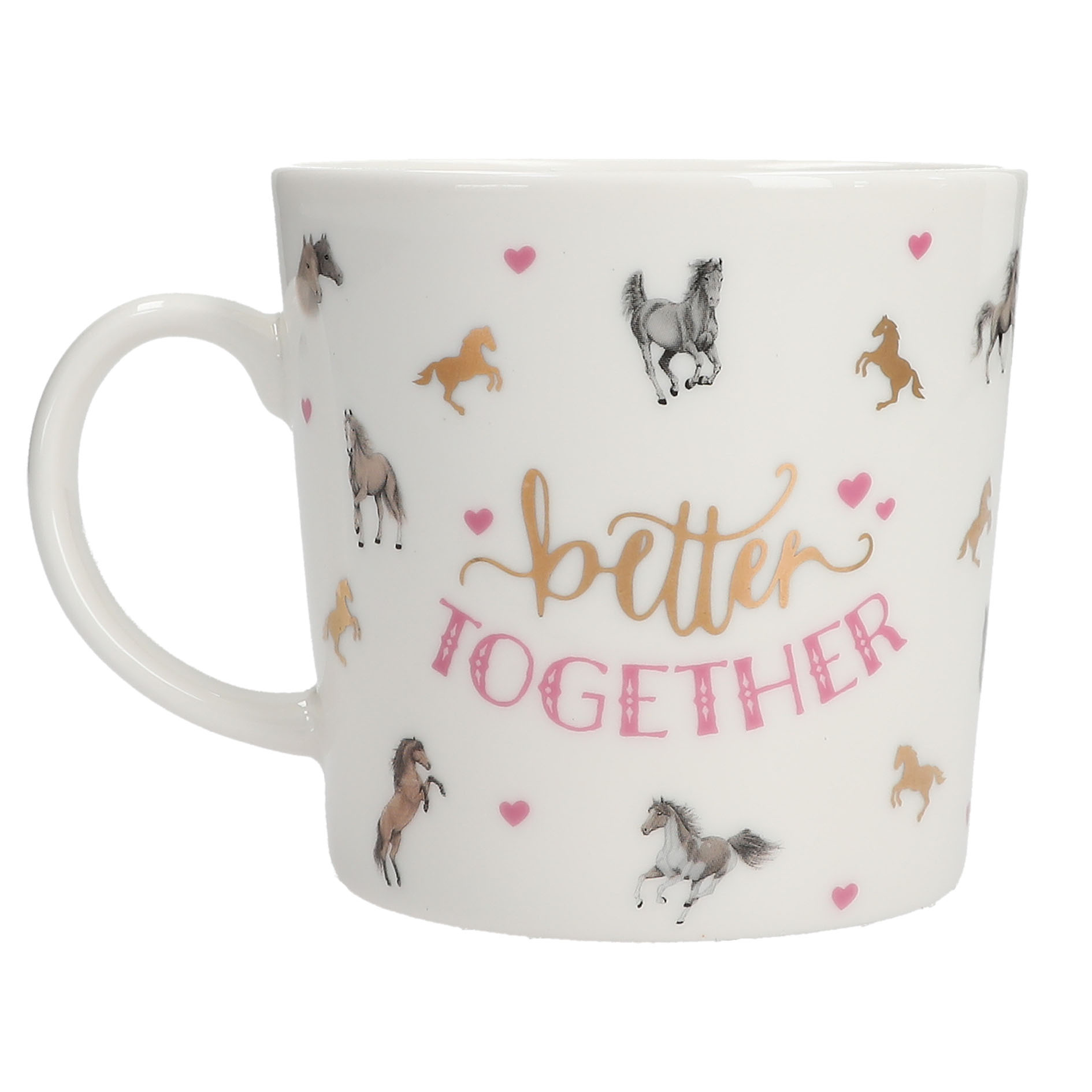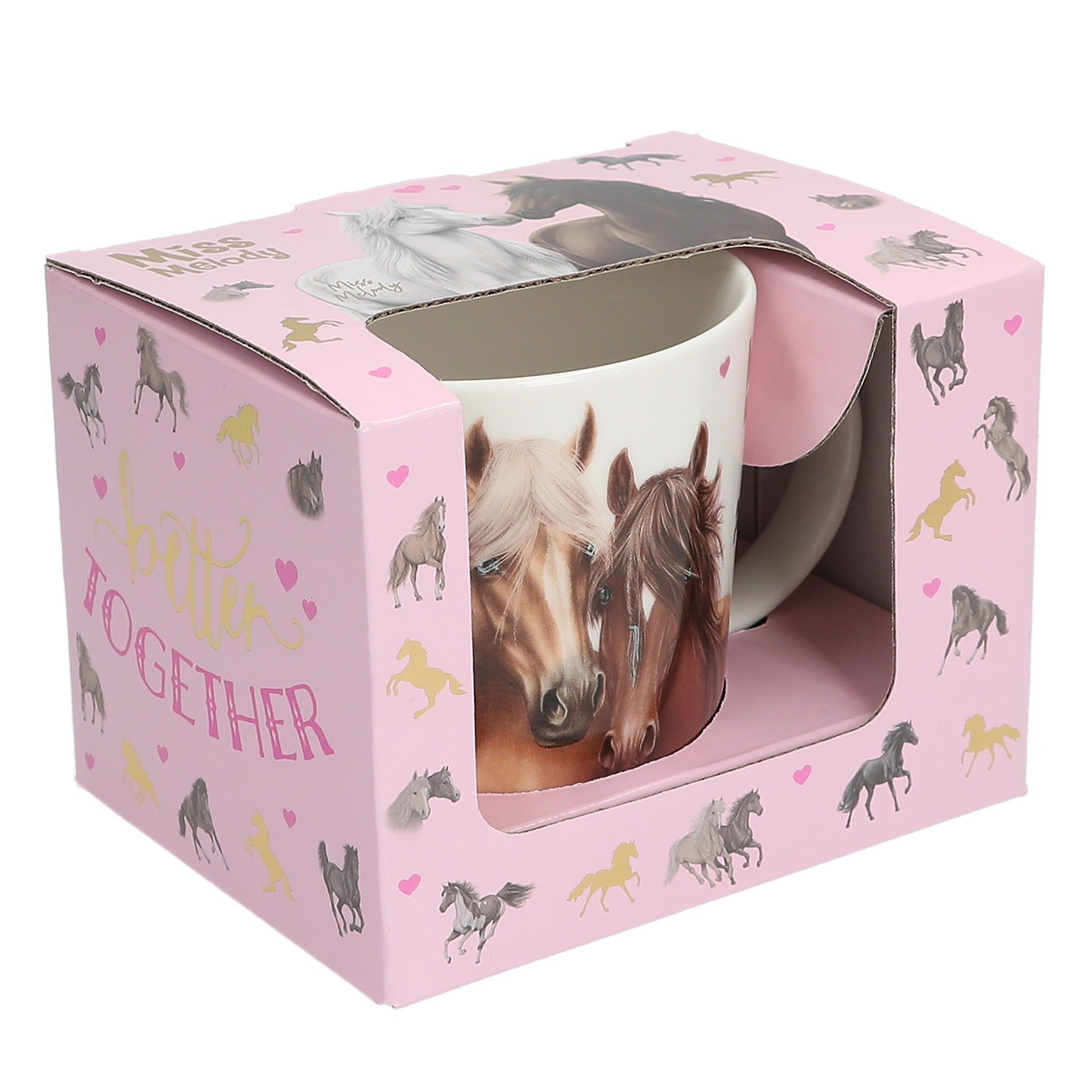 Paardenprachtig: de beker van Miss Melody heeft aan de voorkant een afbeelding van twee paarden en aan de achterkant een tekst. Vanwege de gouden print is de beker niet geschikt voor de magnetron en moet met de hand gewassen worden. Inhoud: 250 ml. Materiaal: New Bone China porselein.