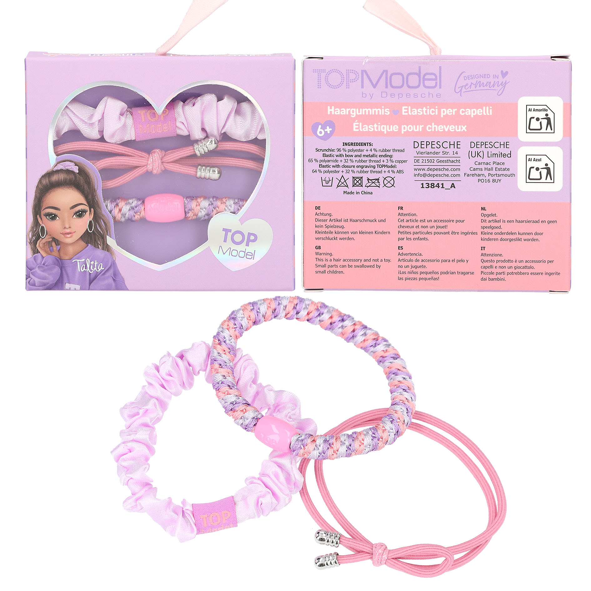 Voor TOPModel prachtige kapsels: de set bevat 1 dunne scrunchie, 1 elastiekje met decoratieve kraal en 1 elastiekje met een strik. Verpakt in een klein doosje met een hartvormig venster. Verkrijgbaar in twee designs: roze en paars.