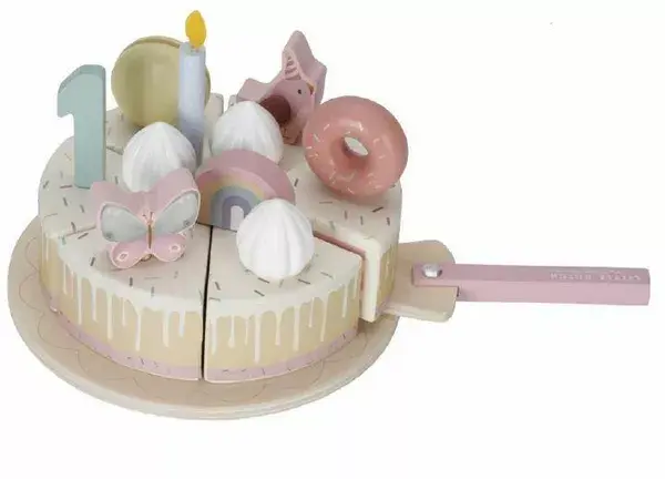 Hieperdepiep hoera! Haal de vlaggentjes tevoorschijn, want met onze taart is het elke dag een feestje! Versier je eigen taart met een macaron, donut, regenboog, beestje en slagroom en trakteer alle gasten op een stukje. Veel plezier op het feest! De set bestaat uit 6 stukjes taart op een plateau, een taartschep, donut, macaron, vogel, vlinder, regenboog, kaarsjes, slagroomtoefjes en cijfertoppers (1-5). 26 Stuks.