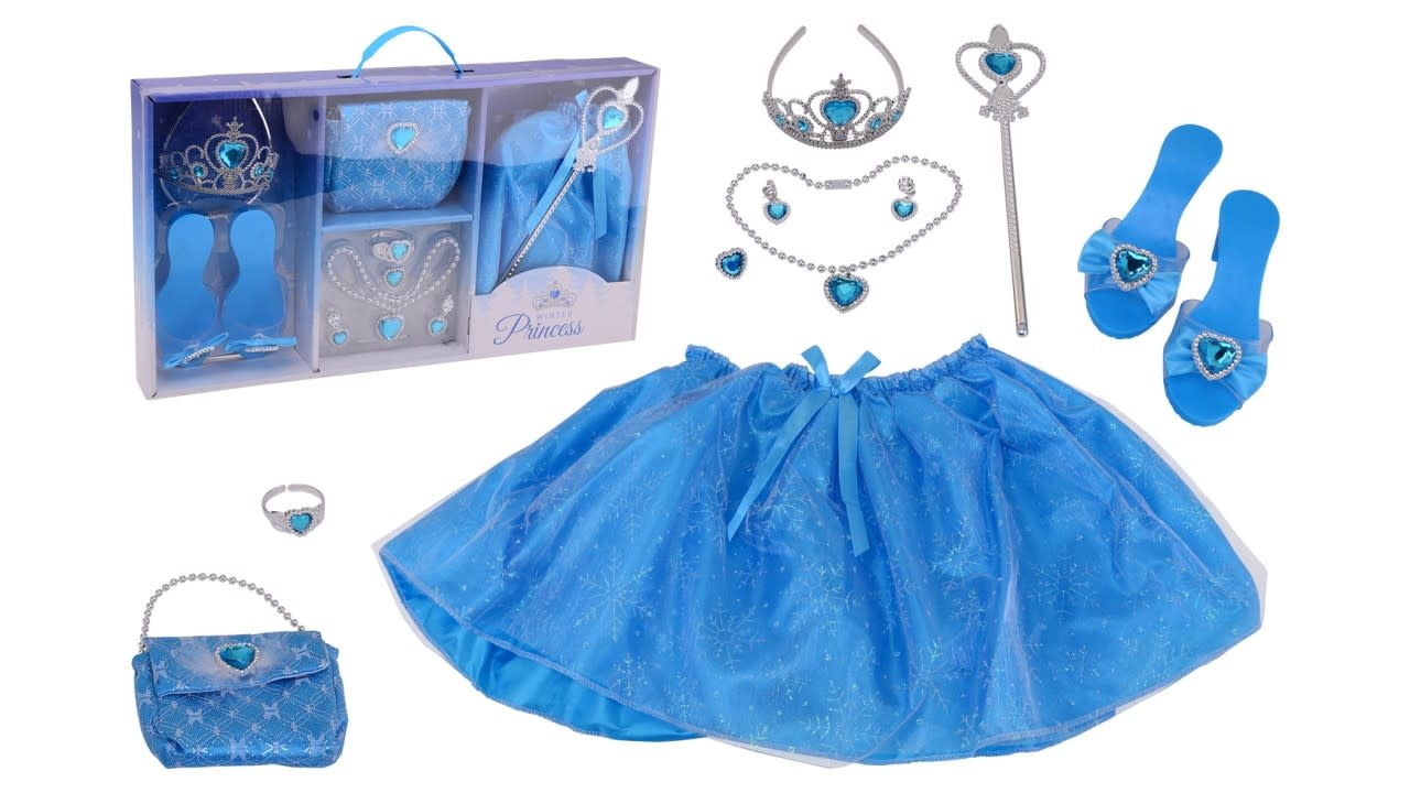 Verkleed jezelf als Ijsprinses Elza met deze complete set. Met rokje, schoentjes, kroontje, sieraden, staf en een schattig tasje.